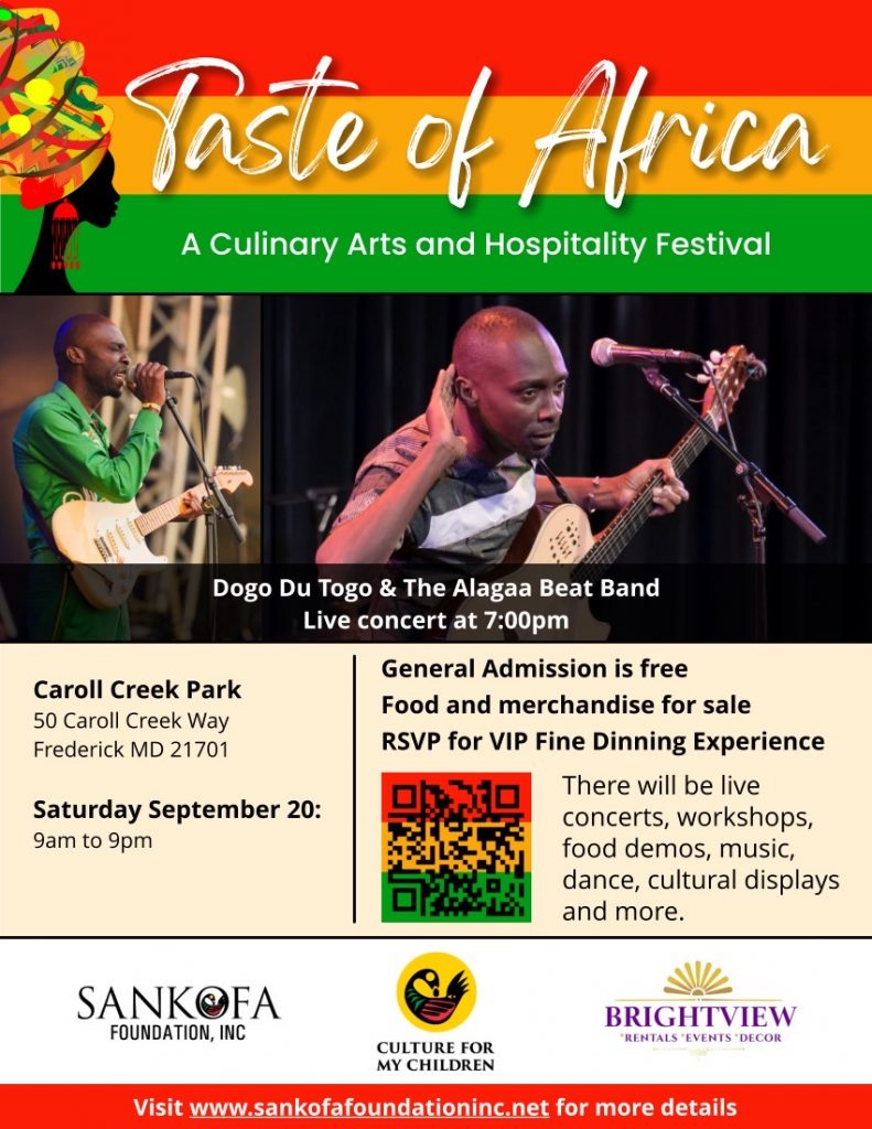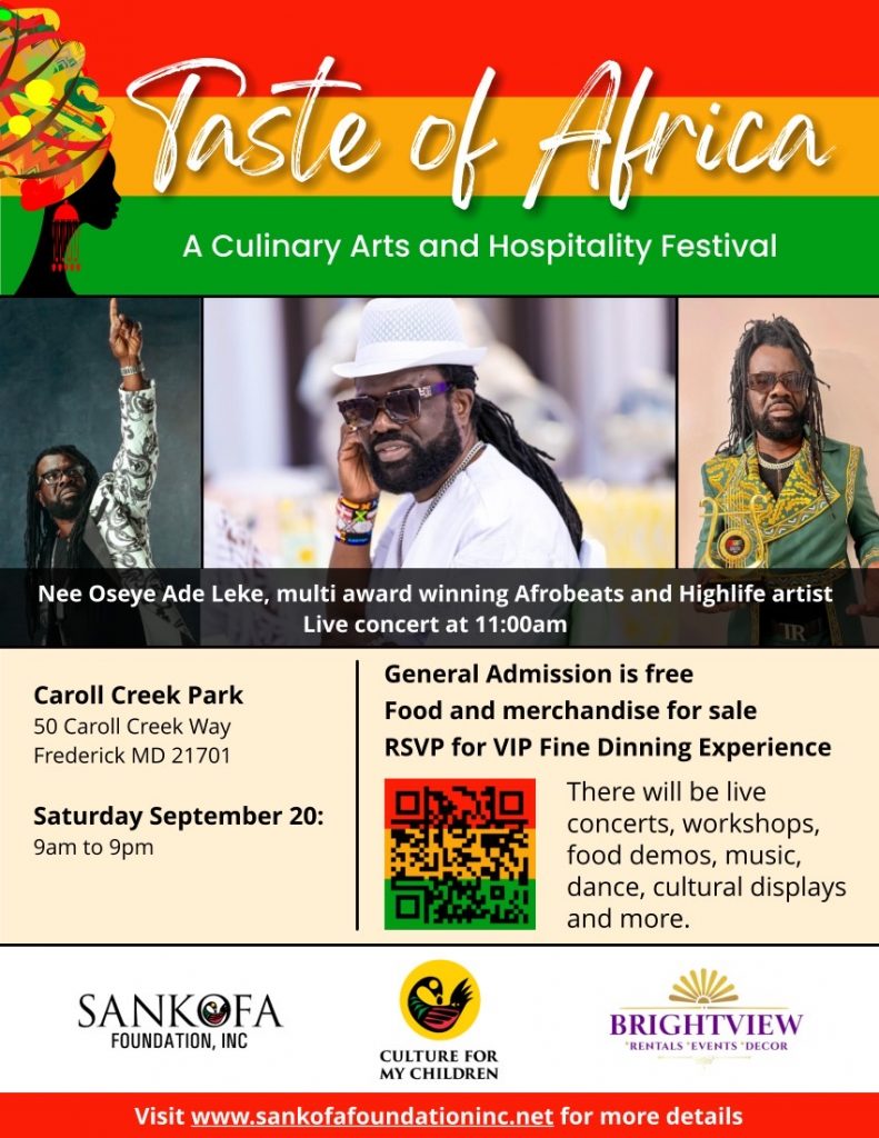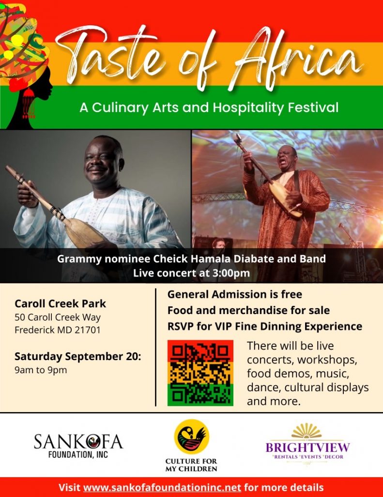 Taste of Africa takes place Saturday, Sept.20th, from 9 a.m. to 9 p.m. at Carroll Creek Linear Park, 50 Carroll Creek Way, Frederick, Md.
